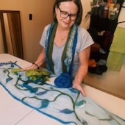 The third piece was not a mistake but an interesting piece that I created as a result of what I learned through my mistakes (lets call it new knowledge and growth), and a technique I explored in class. I call it patchwork. By combining some interesting fabrics and using wool roving as a ‘glue’, I created a heavier double-sided scarf more suitable for fall/winter, or perhaps a table runner. I love this technique because it gives me the opportunity to add interest and depth to my piece. It allows me to create a whole new look while incorporating interesting fabrics with wool.